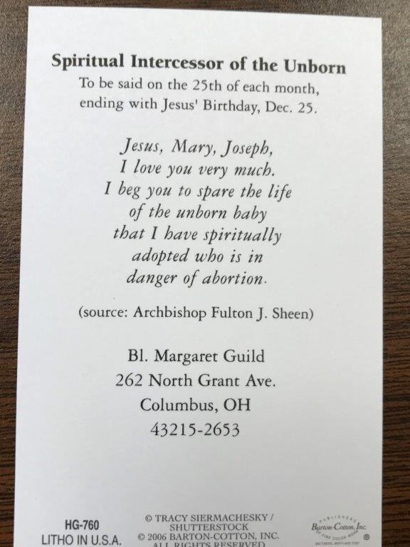 Holy Card-Life is Precious $0.10 Holy Card-Life is Precious quantity Add to cart Category: Prayer Cards Additional information Additional information Weight .001 oz Dimensions 1 × 1 × 1 in Related products Holy Card-photo of the incorrupt Blessed Margaret $0.10 Add to cart Holy Card-Shrine of the Blessed Margaret $0.10 Add to cart Holy card-Saint Margaret of Castello $0.10 Add to cart Holy Card-Mary, Mother of the Unborn $0.10 Add to cart Related